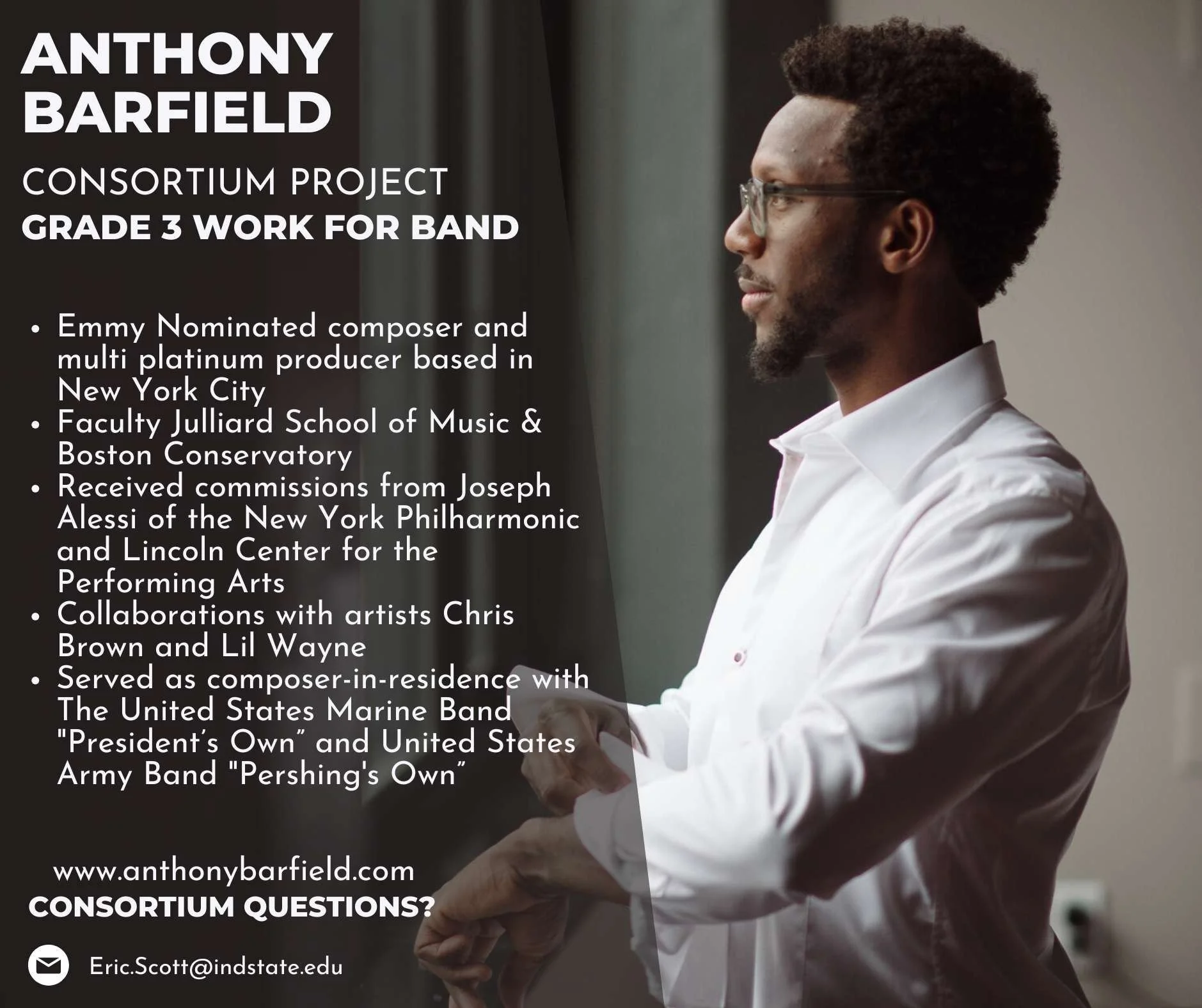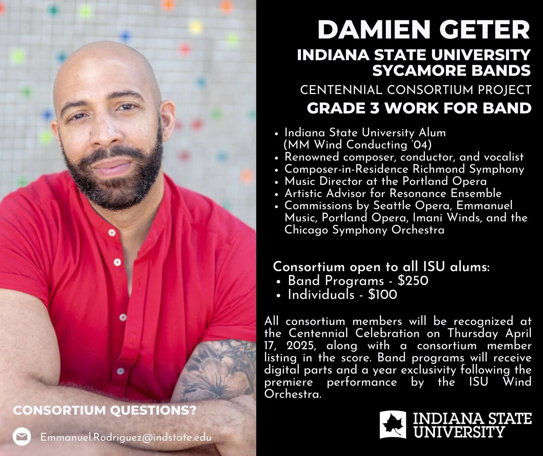 For the centennial celebration of the Indiana State University Bands, we are organizing a grade 3 consortium with ISU alum, Damien Geter. Damien is the composer-in-residence of the Richmond Symphony, Music Director of the Portland Opera, and has written works for the Imani Winds, Chicago Symphony Orchestra, and the Des Moines Opera.